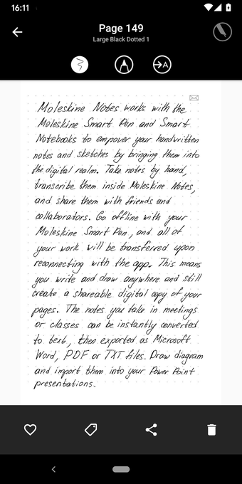 Moleskine Notes pozwala na ręczne robienie notatek, przepisywanie ich wewnątrz aplikacji, a następnie udostępnianie ich znajomym i współpracownikom. Możesz również konwertować swoje odręczne notatki na tekst i eksportować je jako pliki programu Microsoft Word, RTF lub TXT. Dodatkowo, możesz rysować diagramy i importować je do prezentacji PowerPoint, lub eksportować swoje szkice jako grafikę wektorową i kontynuować ich udoskonalanie.
